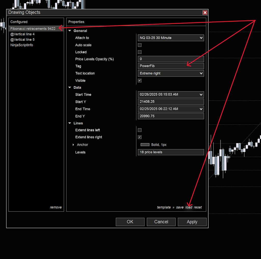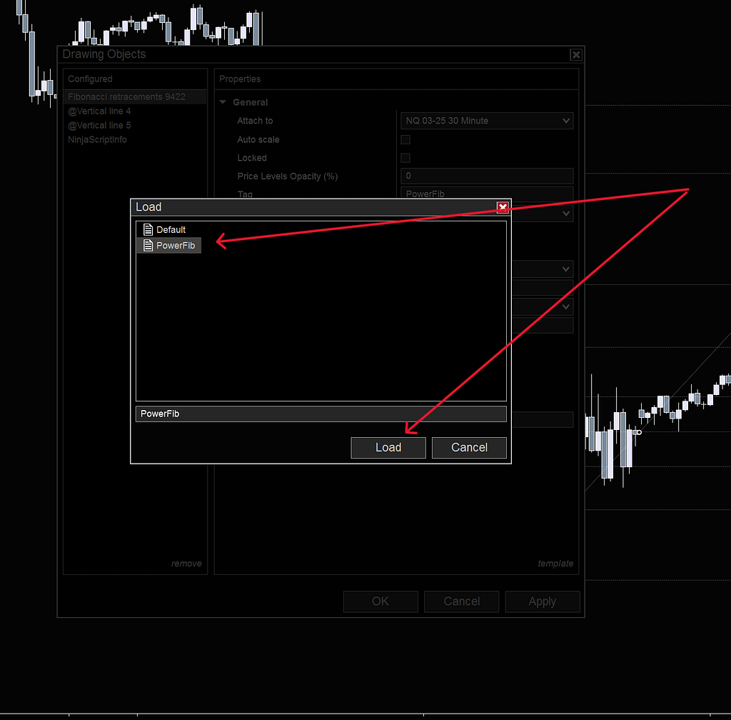 Once we change the name in the “Tag” field to “PowerFib”, the strategy can find the tool on the chart–wherever you’ve place it–and use it to enter, manage and exit trades. We include a template file in the zip file that has all the default Price Levels necessary for the PowerFib Strategy to run successfully. Let’s load that now.