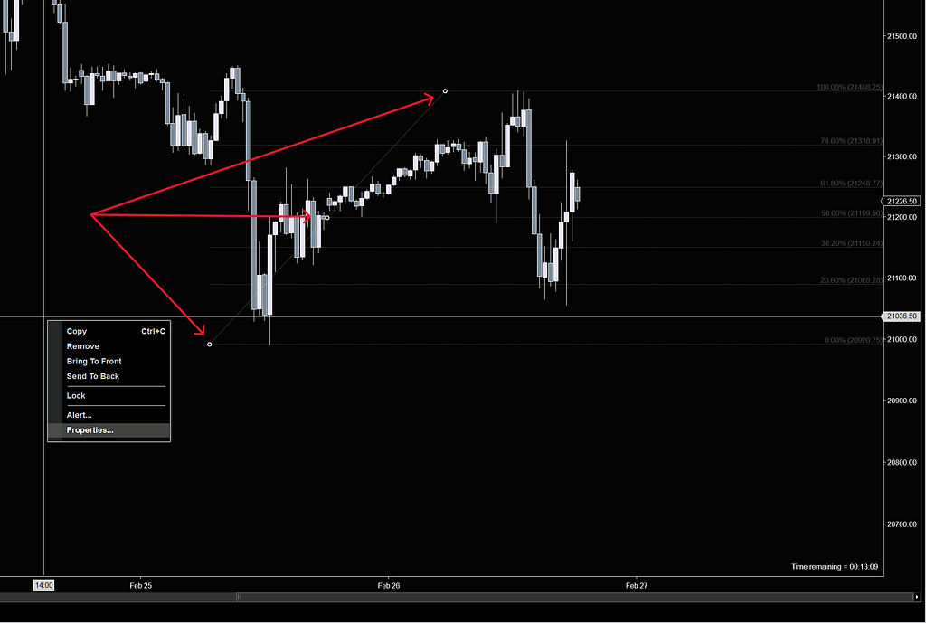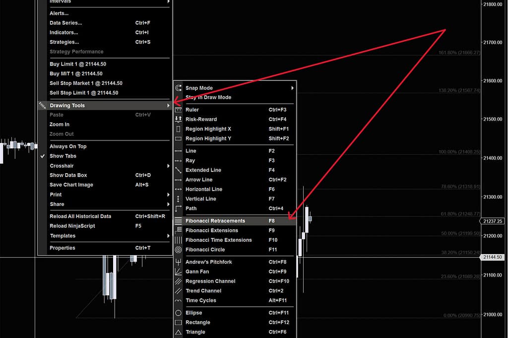 Right click on the chart and choose “Drawing Tools > Fibonacci Retracements” or make it quick and easy and simply tap the default HotKey (F8) and choose your anchor points and draw your Fibonacci Retracement.